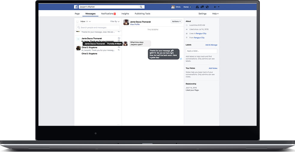 Trang là sự hiện diện của doanh nghiệp bạn trên Facebook. Và cũng giống như cuộc tiếp xúc trực tiếp tại cửa hàng, dịch vụ khách hàng thân thiện, hữu ích và trải nghiệm tích cực trên Trang là những yếu tố phải có để thành công. Điều đó xuất phát từ việc quản lý Trang. Trang được thiết lập để giúp bạn xem, phản hồi các bình luận và tin nhắn của khách hàng một cách nhanh chóng và dễ dàng với các tính năng như thông báo. Ngoài ra, Thông tin chi tiết Trang còn cho bạn thấy bài viết nào đang thu hút được sự quan tâm của mọi người, từ đó có thể giúp bạn tạo ra những bài viết hiệu quả hơn trong tương lai.